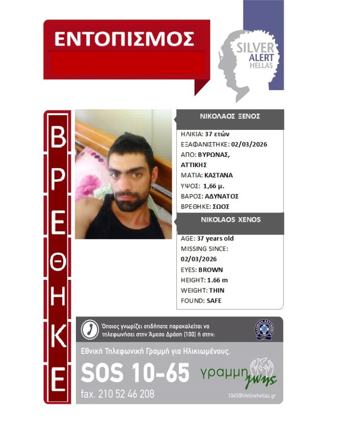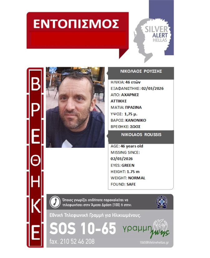 Συγκεκριμένα, ο Ελευθέριος Αξιώτης, 47 ετών, εξαφανίστηκε από το σπίτι του, στην Αγία Παρασκευή Αττικής, το πρωί της 25/03/26, όταν έφυγε για... περισσότερα»