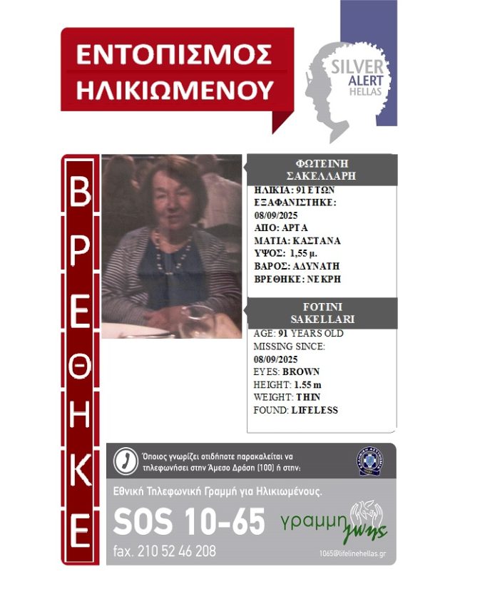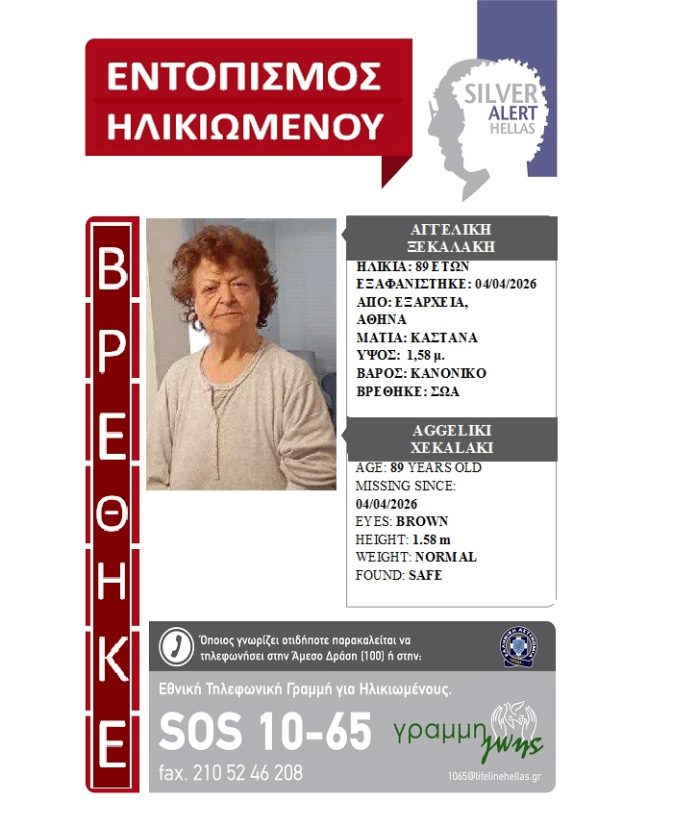 Η περιπέτεια της κας Αγγελικής Ξεκαλάκη έληξε, δίνοντας αίσιο τέλος στην αγωνία των δικών της ανθρώπων που την αναζητούσαν.