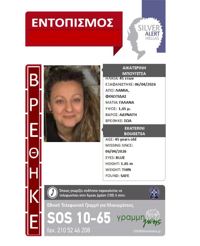Η περιπέτεια της κας Αικατερίνης Μπουγέτσα έληξε, δίνοντας αίσιο τέλος στην αγωνία των δικών της ανθρώπων που την αναζητούσαν. Η 45χρονη, βρέθηκε σώα.