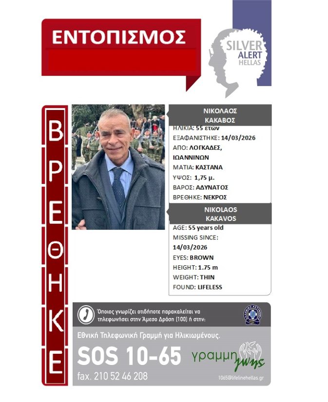 Συγκεκριμένα, ο Νικόλαος Κάκαβος, 55 ετών, εξαφανίστηκε από το σπίτι του, στους Λογγάδες Ιωαννίνων, την 14/03/2026.