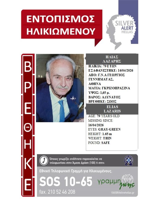 Ο Ηλίας Λάζαρης, 79 ετών, εξαφανίστηκε από το Γ.Ν.Α Γεώργιος Γεννηματάς, στην Αθήνα, το πρωί της 16/04/26.