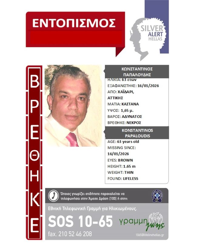 Νεκρός βρέθηκε ο 55χρονος που αναζητούνταν με SILVER ALERT.