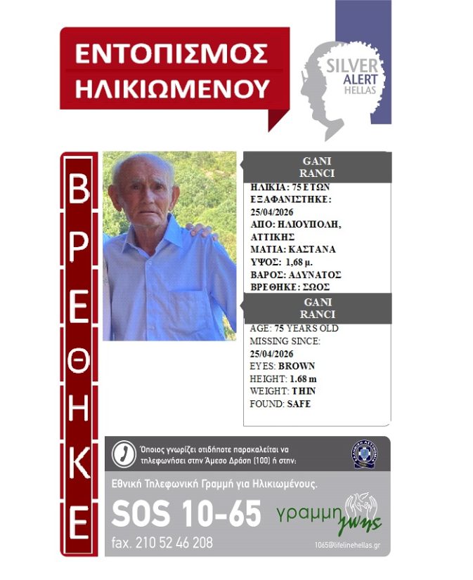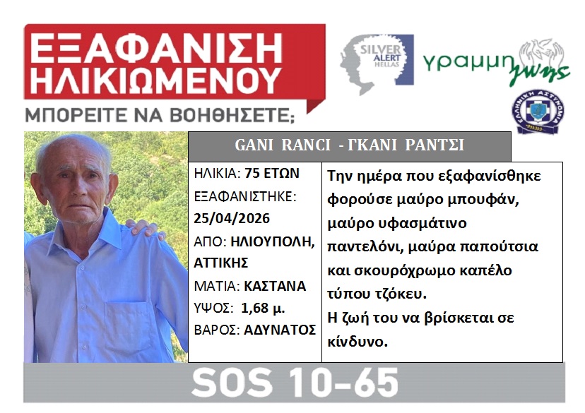 Ο GANI RANCI (ΓΚΑΝΙ ΡΑΝΤΣΙ) 75 ετών, εξαφανίστηκε από το σπίτι του, στην Ηλιούπολη Αττικής, το μεσημέρι της 25/04/26.