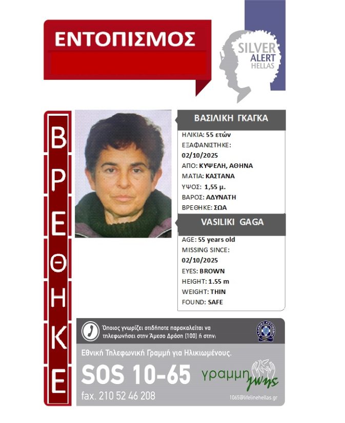 Η υπηρεσία Silver Alert, την 25/10/2025, έλαβε κλήση για την ανεύρεσή της. Η  55χρονη, εντοπίστηκε περιπλανώμενη στον Πειραιά, από πολίτη που είχε δει το SILVER ALERT και αναγνώρισε την αναζητούμενη. Ειδοποιήθηκε η ΕΛ.ΑΣ. και οι συγγενείς και η 55χρονη επέστρεψε σε ασφαλές περιβάλλον.
