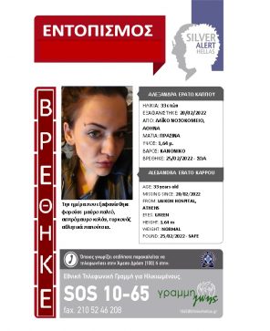 Ευρεθέντες 20 Φεβρουαρίου, 2022 Επέστρεψε σπίτι του, χάρη στο SILVER ALERT Η περιπέτεια του κ. Γρηγορίου Αϊβαζίδη έληξε, δίνοντας αίσιο τέλος στην αγωνία των δικών του […]