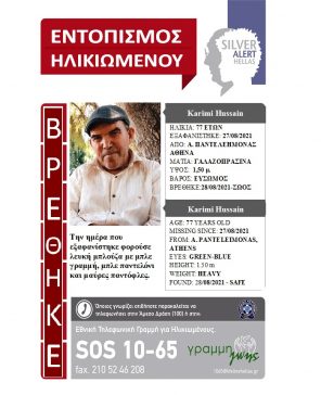 Ευρεθέντες 29 Αυγούστου, 2021 Βρέθηκε σώος ο 77χρονος! Η περιπέτεια του κ. Karimi Hussain έληξε, δίνοντας αίσιο τέλος στην αγωνία των δικών του […]