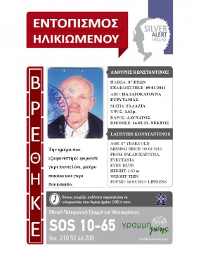Ευρεθέντες 23 Μαρτίου, 2013 Βρέθηκε σώος ο κ. Παναγιώτης Ντεντόπουλος Εντοπίσθηκε σώος ο κύριος Παναγιώτης Ντεντόπουλος, που είχε χαθεί από το Ζερβοχώρι, Παραμυθιάς, Θεσπρωτίας την 05.03.2013 Το βράδυ του Σαββάτου […]