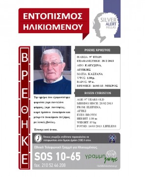 Ευρεθέντες 14 Μαρτίου, 2013 Νεκρός βρέθηκε ο Χρήστος Ρόζης… Δεν είχε αίσιο τέλος η περιπέτεια του Χρήστου Ρόζη που είχε χαθεί από το Ελευσίνα Αττικής την 28.02.2013. Την […]