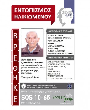 Ευρεθέντες 20 Φεβρουαρίου, 2013 Δεν είχε αίσιο τέλος η περιπέτεια του Στυλιανού Φλισκουνάκη Δεν είχε αίσιο τέλος η περιπέτεια του Στυλιανού Φλισκουνάκη που είχε χαθεί από το Ηράκλειο Κρήτης την 07.01.2013. Την Τετάρτη […]