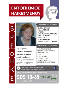 Ευρεθέντες 7 Απριλίου, 2016 Βρέθηκε, χάρη στο SILVER ALERT! Η περιπέτεια της κας Ασημίνας Καράμπελα έληξε, δίνοντας αίσιο τέλος στην αγωνία των δικών της ανθρώπων που την αναζητούσαν. Η […]