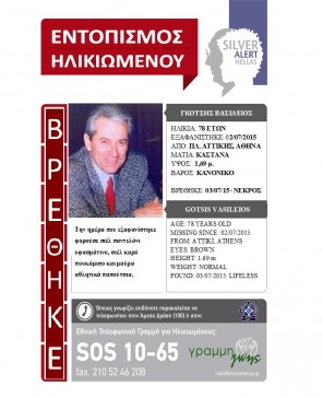 Ευρεθέντες 23 Ιουλίου, 2015 Βρέθηκε σώος χάρη στο SILVER ALERT ο κ. Γεώργιος Σταθόπουλος! Η περιπέτεια του κου Γεωργίου Σταθόπουλου έληξε, δίνοντας αίσιο τέλος στην αγωνία των δικών του ανθρώπων που τον αναζητούσαν. […]