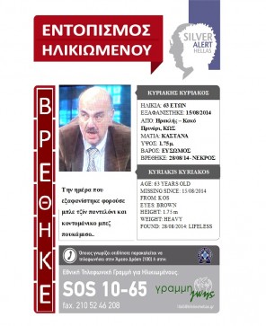 Ευρεθέντες 7 Σεπτεμβρίου, 2014 Σώος βρέθηκε ο κ. Τριαντάφυλλος Στάμου, χάρη στο SILVER ALERT! Η περιπέτεια του κου Τριαντάφυλλου Στάμου έληξε, δίνοντας αίσιο τέλος στην αγωνία των δικών του ανθρώπων που τον αναζητούσαν. Ο […]