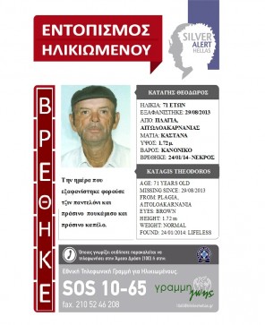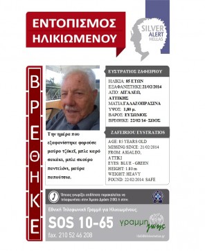 Ευρεθέντες 14 Μαρτίου, 2014 ΒΡΕΘΗΚΕ ΧΑΡΗ ΣΤΟ SILVER ALERT! Η περιπέτεια της κας Παναγούλας Παναγιωτοπούλου έληξε, δίνοντας αίσιο τέλος στην αγωνία των δικών της ανθρώπων που την αναζητούσαν. Η […]