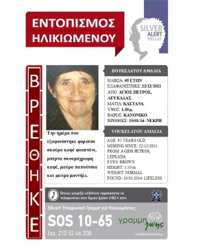 Ευρεθέντες 18 Ιανουαρίου, 2014 Η οικογένειά του και πάλι δίπλα του, χάρη στο SILVER ALERT! Η περιπέτεια του κου Γεμιτζάκη Γεωργίου έληξε, δίνοντας αίσιο τέλος στην αγωνία των δικών του ανθρώπων που τον αναζητούσαν. Ο […]